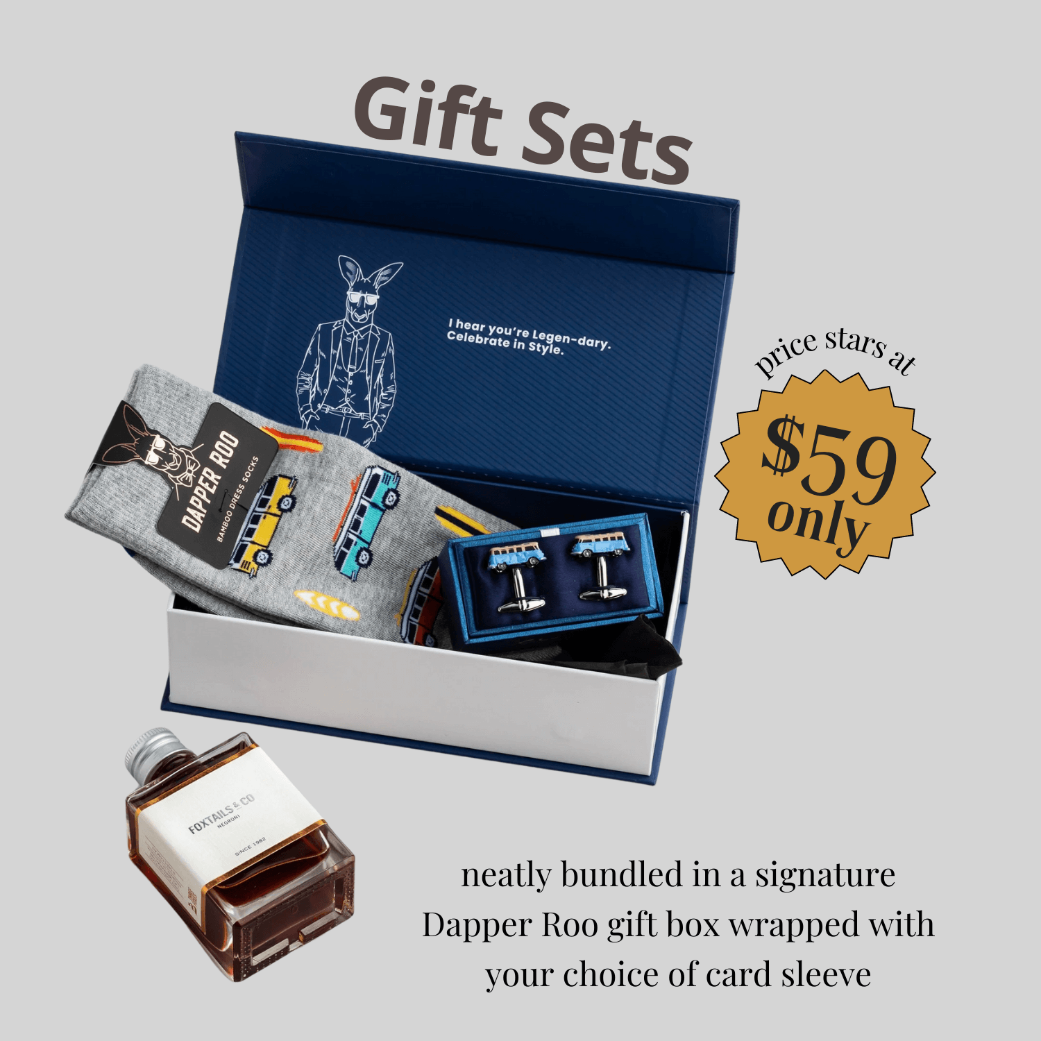 Includes a pair of Dapper Roo socks, a pair of Clinks cufflinks/tie clip and a 110mls Foxtails & Co Cocktail of your choice