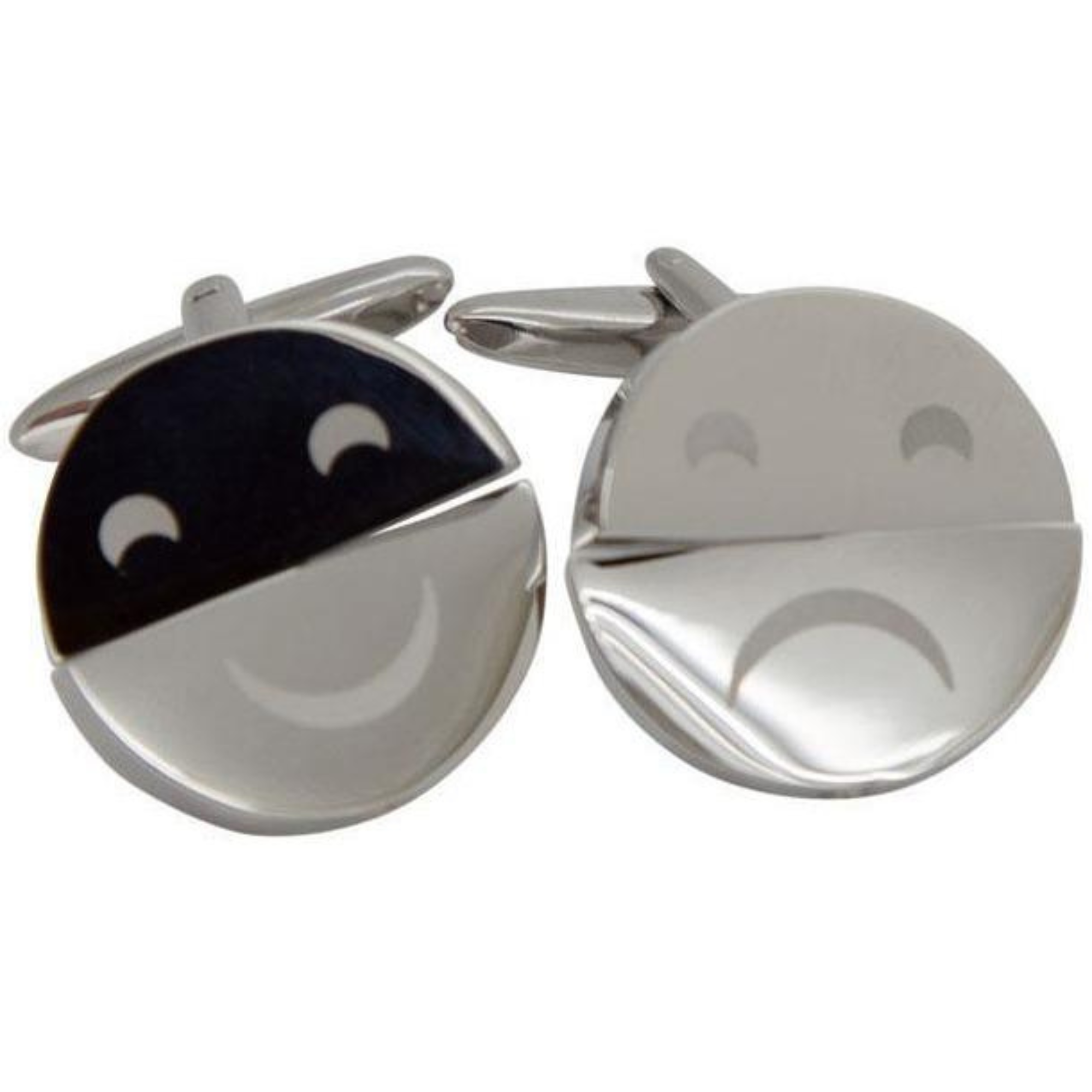 Simply twist the bottom section of these cufflinks around to reveal a happy or sad face. These silver cufflinks have a great shiny silver rhodium-plated finish and are a great talking point. Can be worn on ANY dress shirt with Shirt Cuff Adapter. Presented in a classy gift box they also make a great present for that special someone.