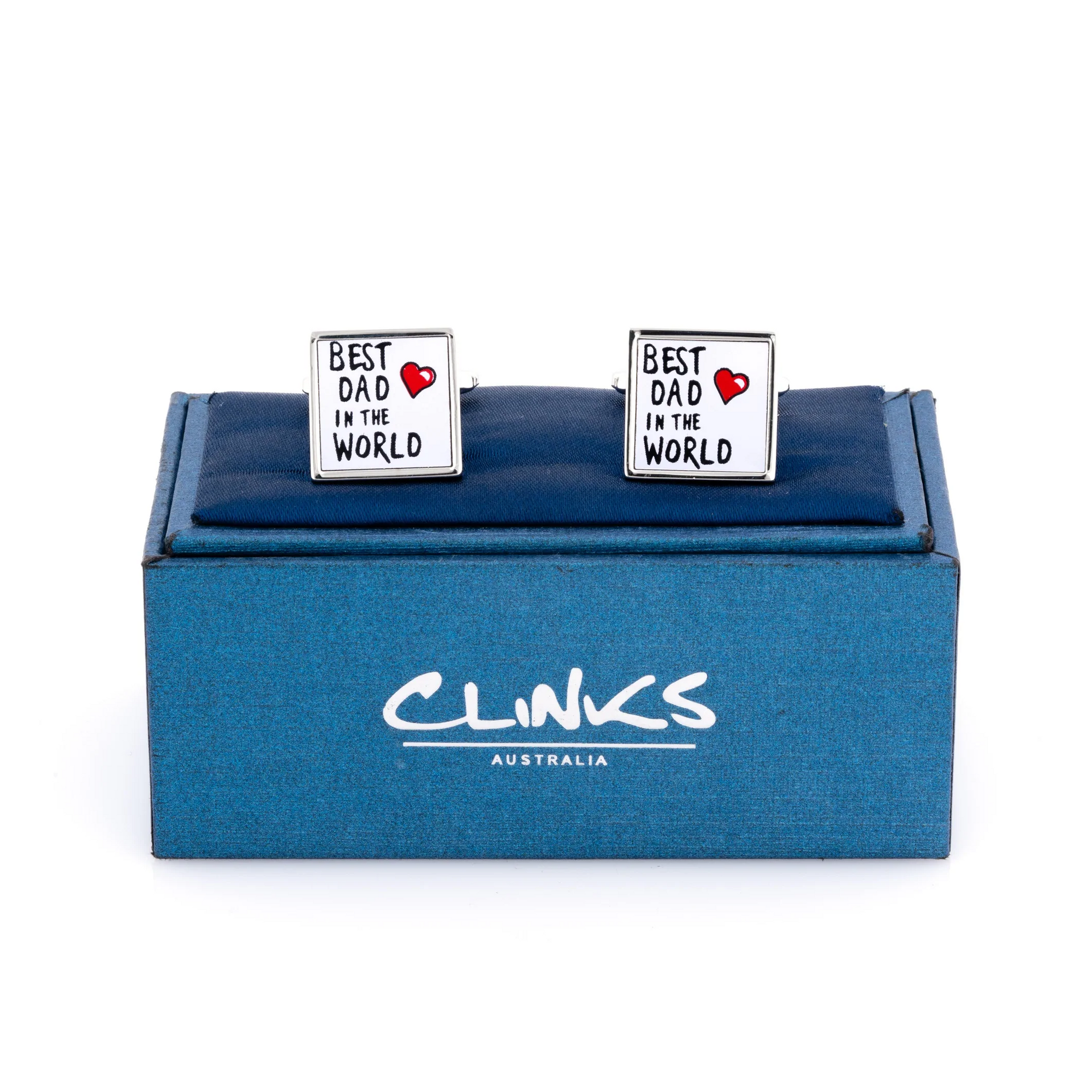Comes in a stylish gift boxThis pair of "Best Dad in the World" cufflinks is one of the best presents a son or daughter could give their father. These cufflinks are sure to make a lasting impression and be a well treasured git. Finished Rhodium SIlver and Enamel these look great on any shirt.